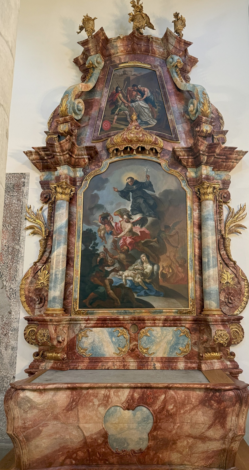 Très rapidement, on se rend compte que cet autel est vraiment un bijou. Les couleurs rose/rouge et bleu ciel, sobres dans le bas de l’autel, de plus en plus ornées vers la partie haute forment un écrin assez remarquable pour les deux tableaux.